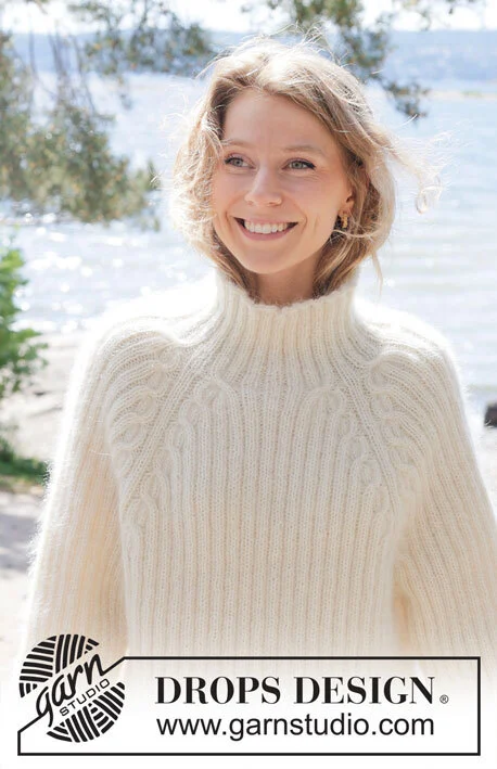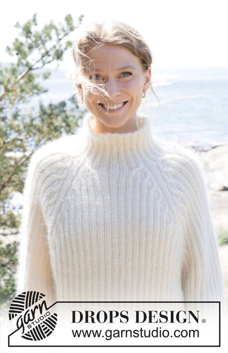 GARN: DROPS ALPACA fra Garnstudio (tilhører garngruppe A) 350-400-400-450-500-550 g farve 100, natur Og brug: DROPS KID-SILK fra Garnstudio (tilhører garngruppe A) 275-300-325-350-400-425 g farve 01, natur