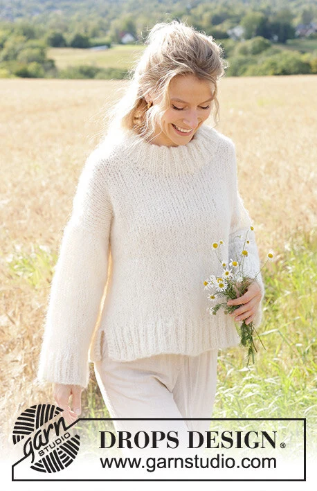 Strikket bluse i DROPS Melody. Arbejdet strikkes oppefra og ned med skrå skulder/ europæisk skulder, slids i siden og dobbelt halskant. Størrelse XS - XXL.