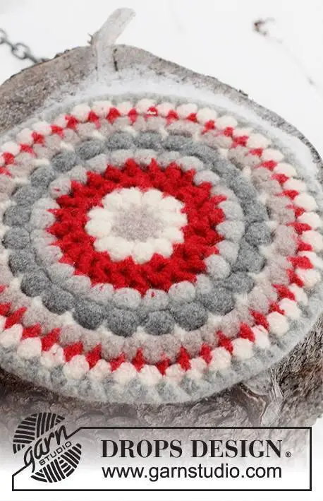 Hæklet og filtet siddeunderlag i DROPS Snow. Arbejdet hækles rundt fra midten og ud. Tema: Jul.