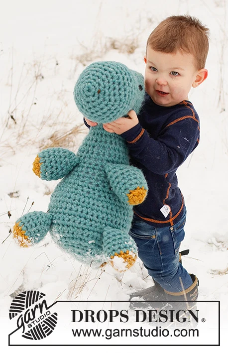 Hæklet dinosaurus Tyrannosaurus Rex (T-Rex) i 2 tråde DROPS Snow. Arbejdet hækles fra snude til hale med kun en søm. Tema: tøjdyr.