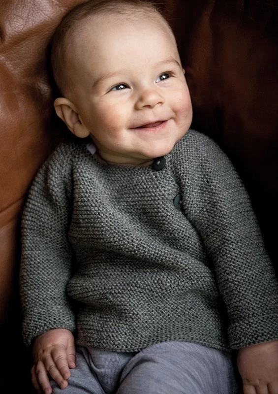 Hvem kan stå for denne fine lille trøje strikket i Mayflower Easy Care. Den er så nem og fin og den lille føler sig rigtig godt tilpas i den. Her er den strikket til den lille dreng, men kan med lethed også bruges til den lille pige.