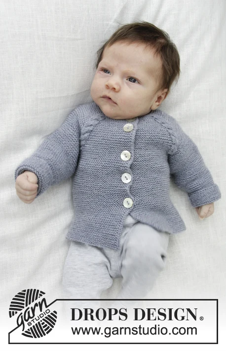 Jakke med snoninger, retstrik og raglan, strikket ovenfra og ned. Størrelse præmatur – 4 år. Arbejdet er strikket i DROPS Baby Merino.