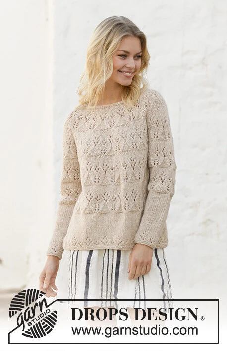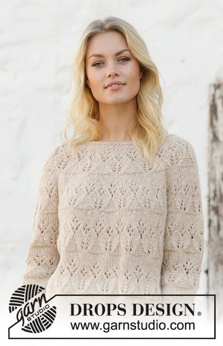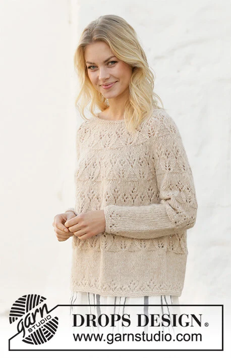 Strikket bluse med rundt bærestykke i DROPS Air. Arbejdet strikkes med hulmønster. Størrelse S - XXXL.