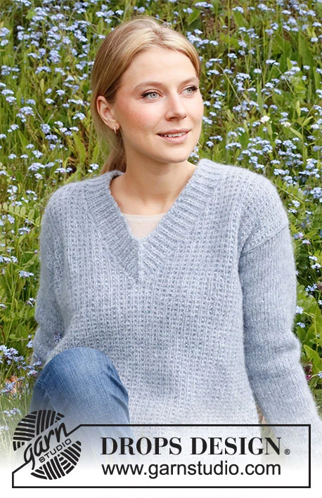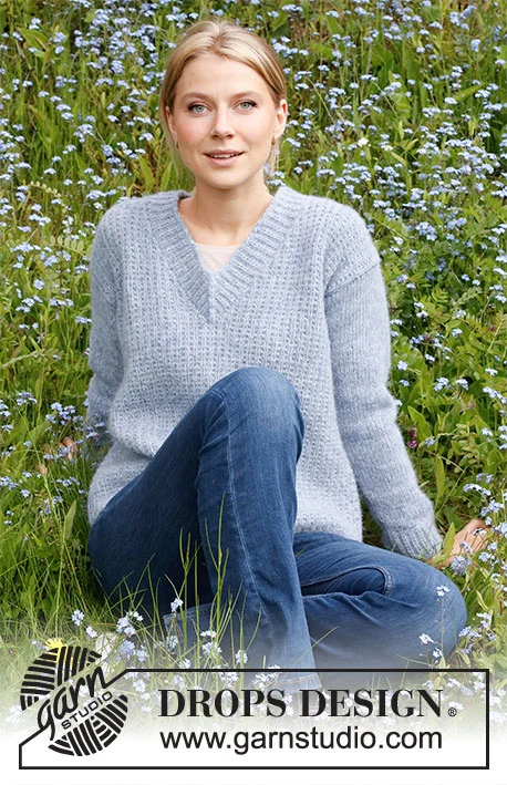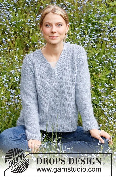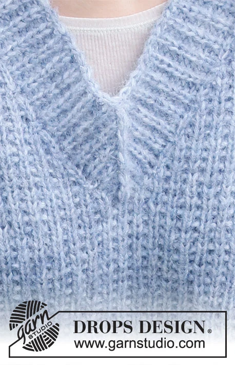 Strikket bluse med v-hals og strukturmønster i DROPS Air. Størrelse XS - XXXL.