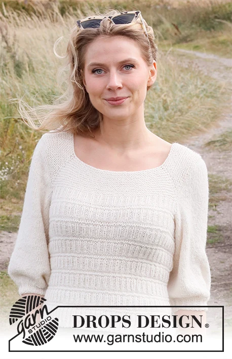 Strikket bluse i DROPS Sky. Arbejdet strikkes ovenfra og ned med raglan, strukturmønster og ¾ lange pufærmer. Størrelse S - XXXL.