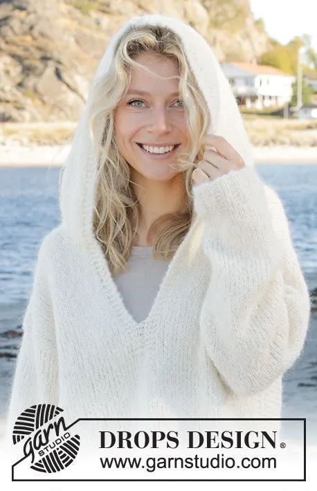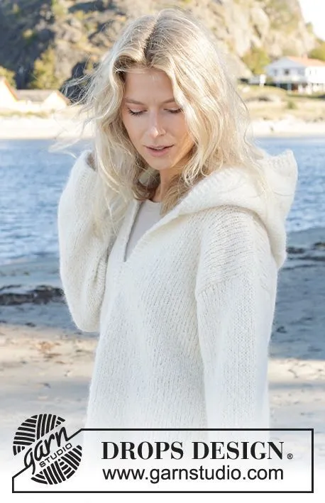 Strikket bluse i DROPS Melody. Arbejdet strikkes nedefra og op med isyede ærmer, slids i halsen og hætte. Størrelse S - XXXL.
