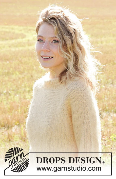 Strikket bluse i 3 tråde DROPS Kid-Silk. Arbejdet strikkes oppefra og ned i glatstrik med dobbelt halskant og raglan. Størrelse S - XXXL.
