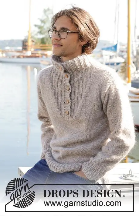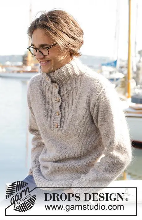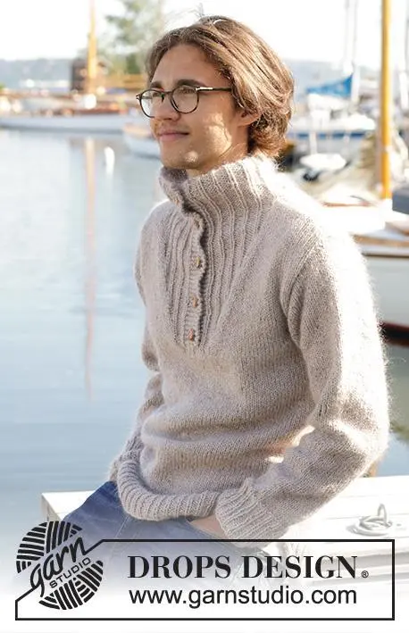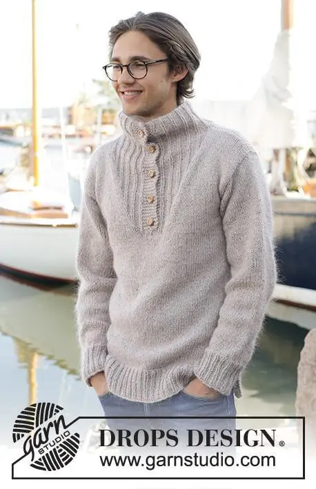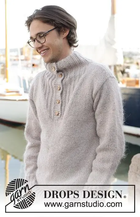 Strikket bluse til herre i DROPS Soft Tweed og DROPS Kid-Silk til herre. Arbejdet strikkes nedefra og op med høj hals. Størrelse S - XXXL.