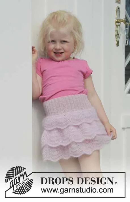 Strikket nederdel med bølgemønster, flæser og rib i DROPS Kid-Silk og DROPS Alpaca eller brug kun Safran. Til børn i størrelse 2 - 10 år.