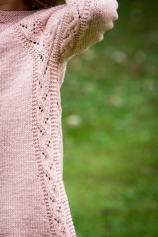 Tunikaen har et smart flot enkelt hulmønster med snoning der er i siden og som en ekstra flot detalje går op i den fine raglan. Tunikaen har som ekstra detalje retriller i kanterne istedet for den traditionelle rib.