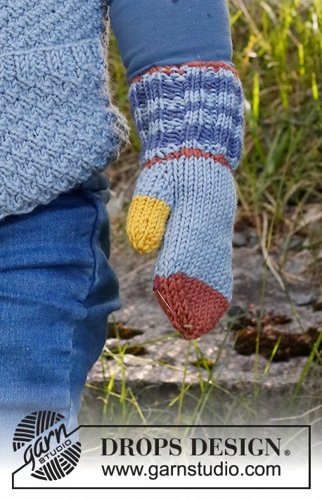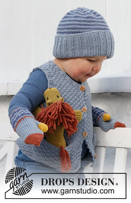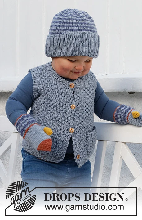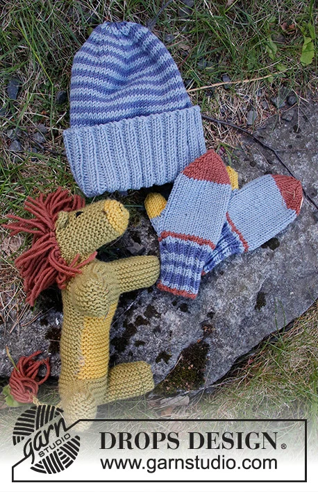 Strikket hue og vanter til baby og børn i DROPS Merino Extra Fine med striber. Størrelse 12 mdr – 12 år.