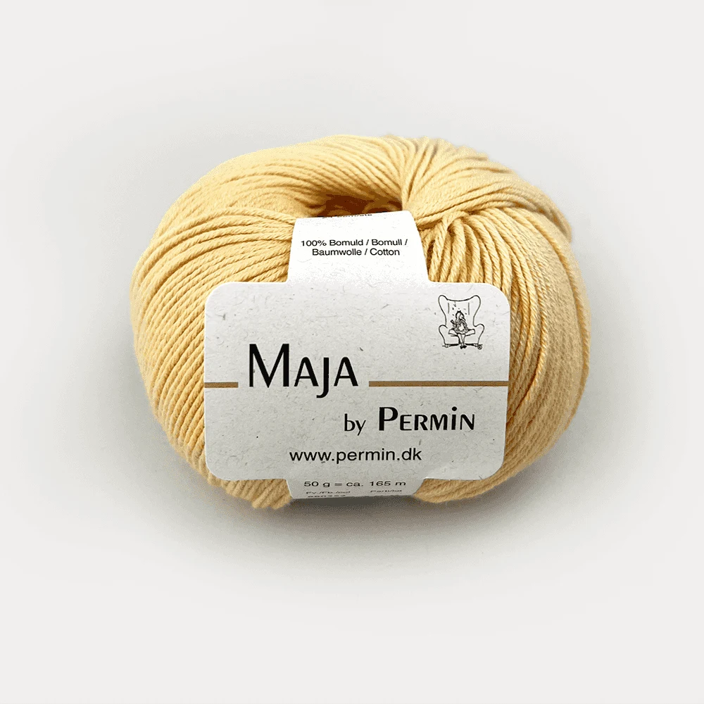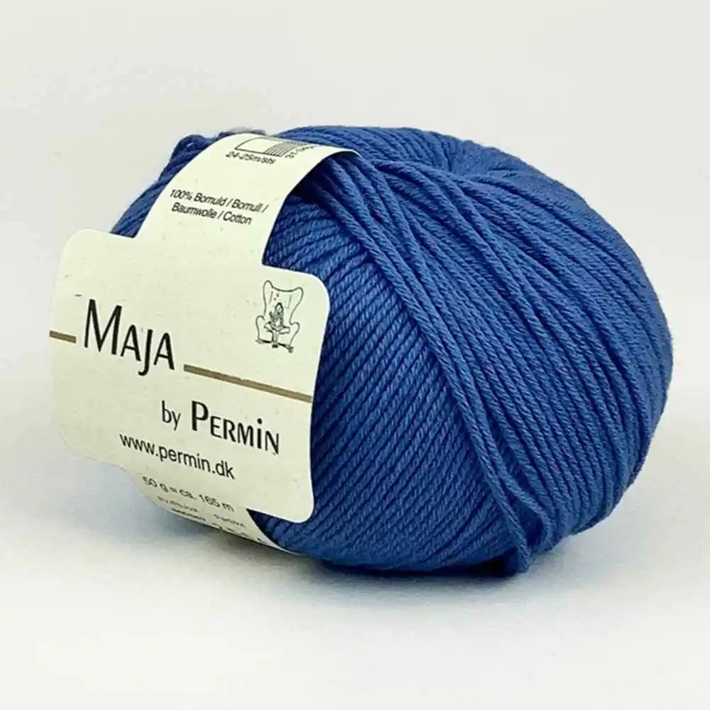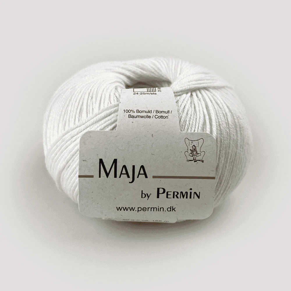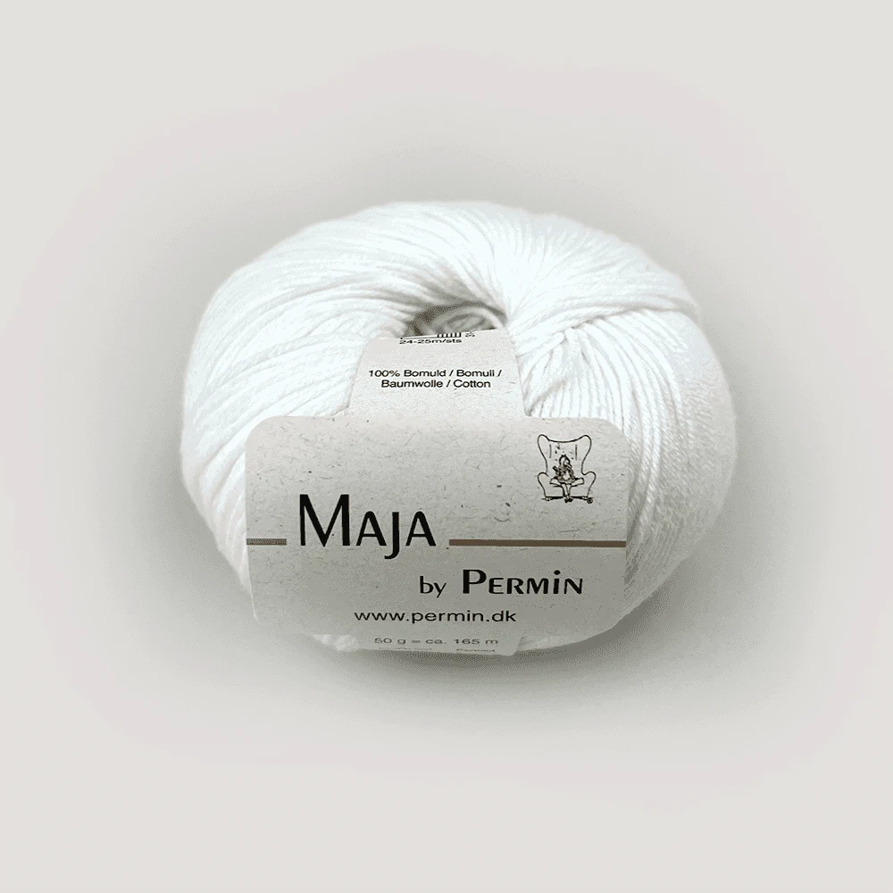 Permin Maja er et eksklusivt bomuldsgarn i 100% bomuld, der fås i 20 forskellige farver. De lange, tætspundne fibre gør garnet let og elastisk, hvilket giver et jævnt og eksklusivt resultat. For mere farverigt strik findes Maja også i en flerfarvet udgave, Maja Color by Permin.