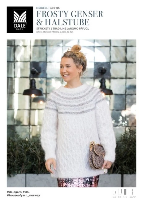 15 m glatstrik med 1 tråd PÅFUGL eller 3 tråder BLING på p nr 6 = 10 cm. 20 m flettestrik på p nr 6 = 10 cm.