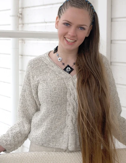 Genser med tykke flette er strikket i BabySilk og Tynn Alpakka fra Du Store Alpakka. Alternativ til Tynn Alpakka: Fin eller Hverdags.