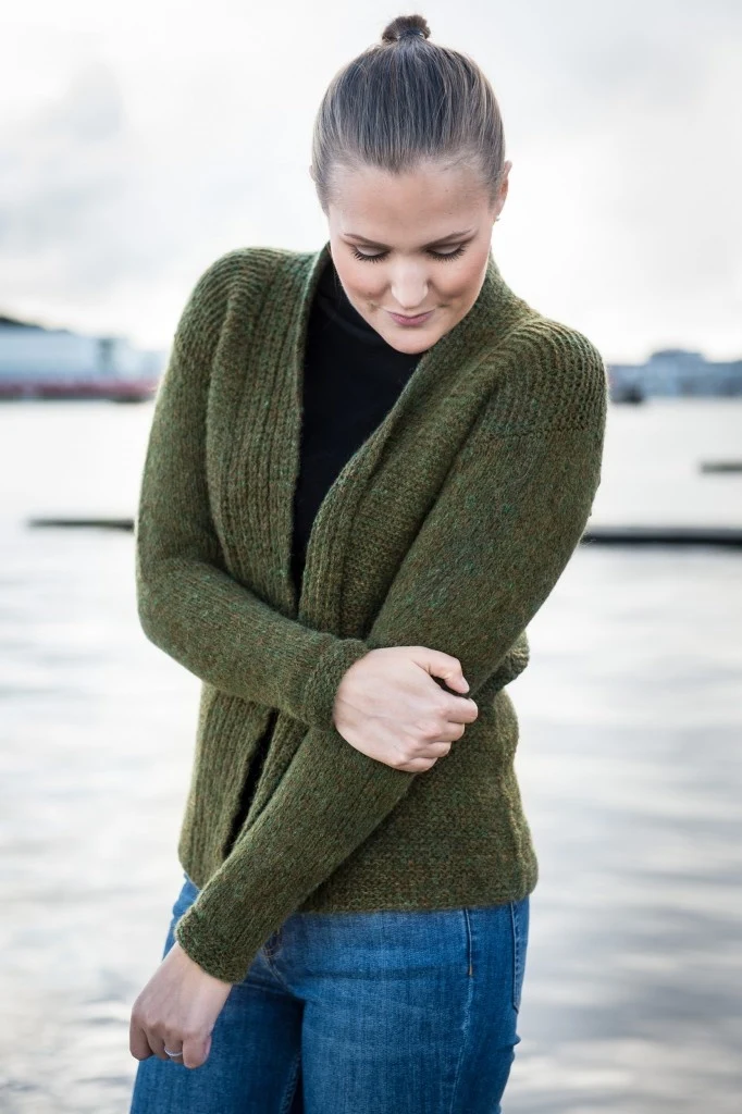 Ungdommelig flot jakke med sjalskrave rundt. Denne flotte seje jakke er strikket i retriller på for og bagstykker og så med den detalje at ærmerne er strikket i glatstrik som en lille kombination. Det er en meget nem jakke at strikke og den henvender sig derfor også til nybegyndere. Mayflower Sky er den lækre kvalitet som denne jakke er designet i.