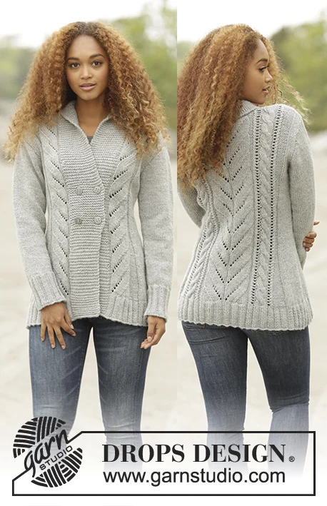 Strikket DROPS jakke i ”DROPS Alaska” med snoninger og sjalskrave. Str S - XXXL.