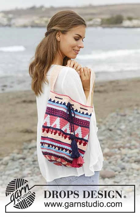 Hæklet taske med flerfarvet mønster. Arbejdet er hæklet i DROPS Paris.
