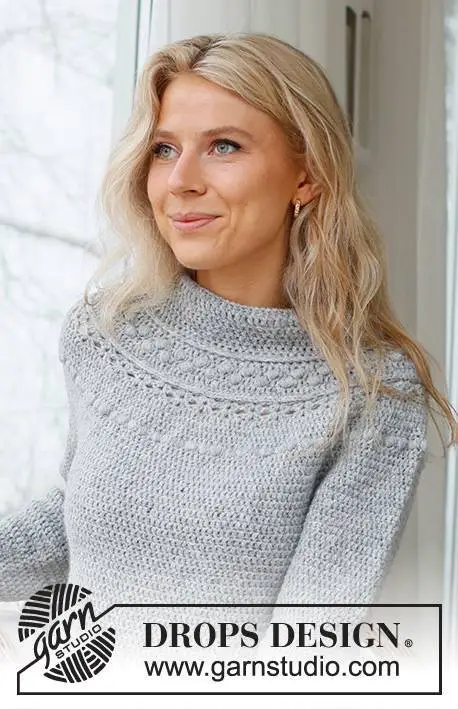 Hæklet bluse i DROPS Sky. Arbejdet hækles oppefra og ned med rundt bærestykke, dobbelt halskant, reliefmønster, hulmønster og bobler. Størrelse S - XXXL.