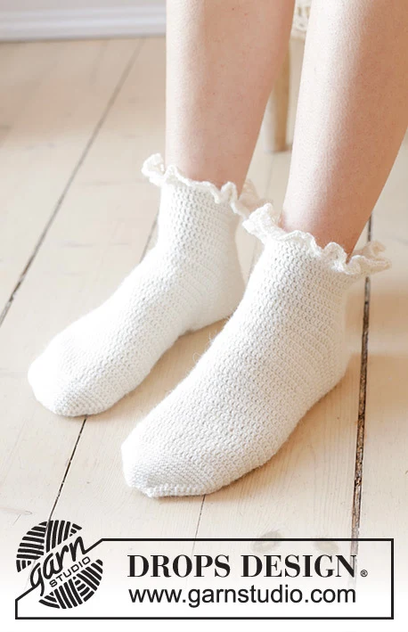 Hæklede sokker / ankelsokker i DROPS Fabel. Arbejdet hækles oppefra og ned med flæsekant. Størrelse 35 - 43.