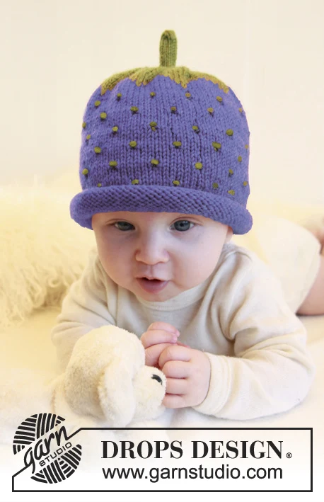 Strikket jordbær eller blåbærhue til baby og børn i DROPS Alpaca.