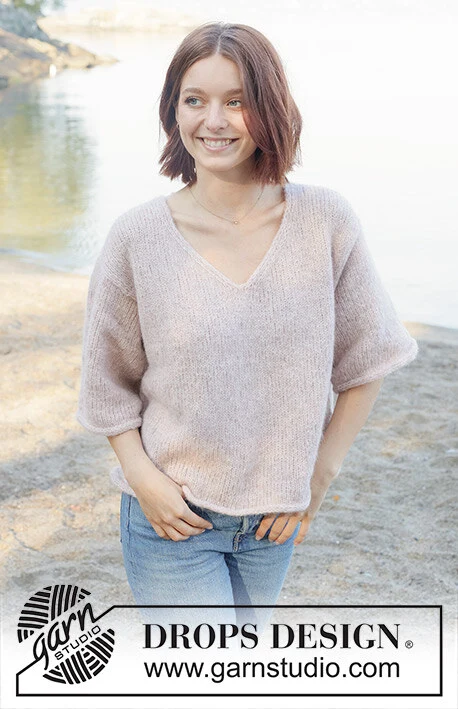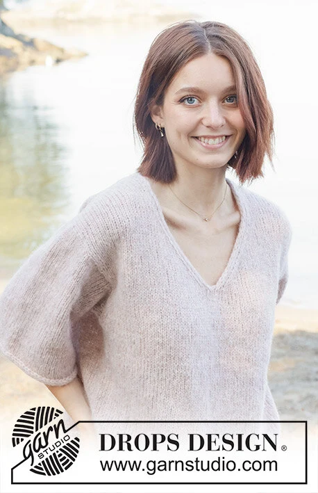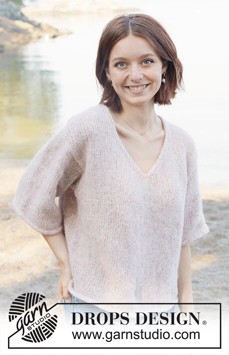 Strikket bluse i DROPS Air. Arbejdet strikkes oppefra og ned med europæisk skulder / skrå skulder, v-hals, i-cord og korte ærmer. Størrelse XS - XXL.