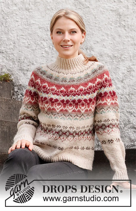 Strikket bluse i DROPS Air. Arbejdet strikkes ovenfra og ned med rundt bærestykke og nordisk mønster. Størrelse S - XXXL.