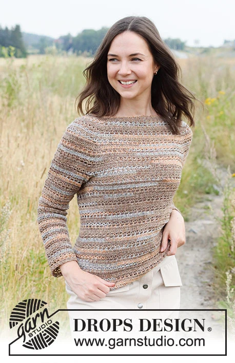 Hæklet bluse i DROPS Fabel. Arbejdet hækles ovenfra og ned med rundt bærestykke og hulmønster. Størrelse XS - XXL.