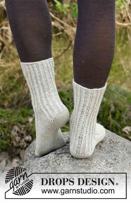 Strikkede sokker med snoninger. Størrelse 35 - 43. Arbejdet er strikket i DROPS Fabel.