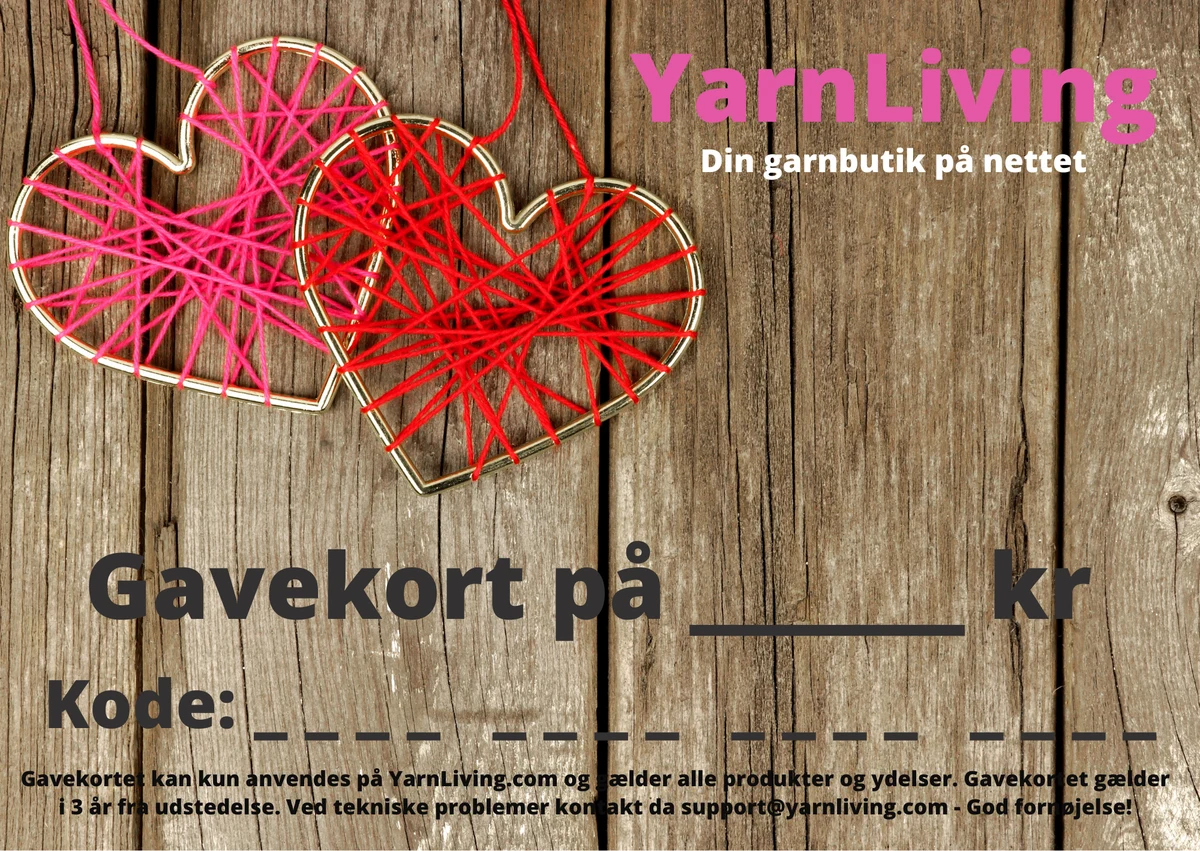 Gavekortet kan bruges frit i hele YarnLiving-webshoppen og gælder til alle produkter. Beløbet vælges i faste intervaller fra 50 kr til 1000 kr. Har du brug for et større beløb, kan flere gavekort nemt kombineres.