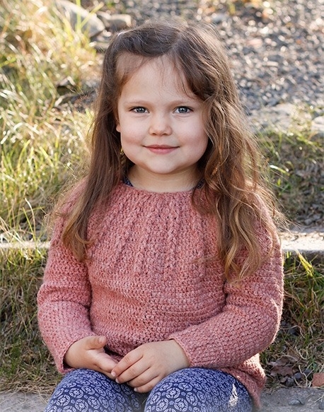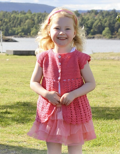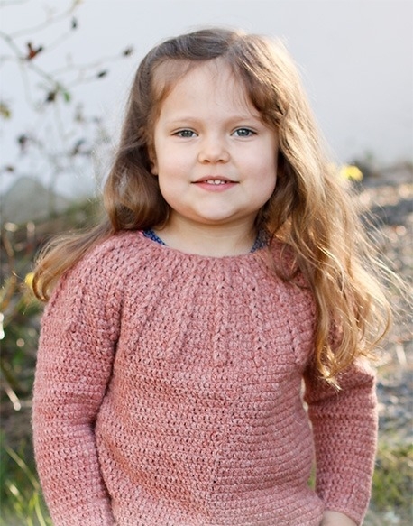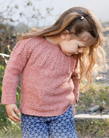 Hæklet tøj behøver heller ikke kun at være til voksne. Blusen herover er hæklet med et rundt bærestykke, så der er god bevægelsesplads i blusen til de små. Den er hæklet i Drops Sky, som er et lækkert og helt unikt alpaca garn, som giver en masse luft mellem fibrene. Dette bidrager til en god åndbarhed, og så er det også god til at temperaturregulere. Derfor er dette garn rigtigt godt til børnetøj.