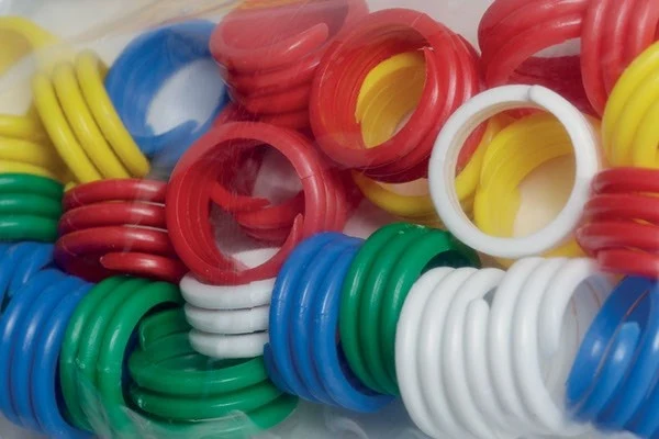 Pose med ca. 25 stk hønseringe i assorterede farver.