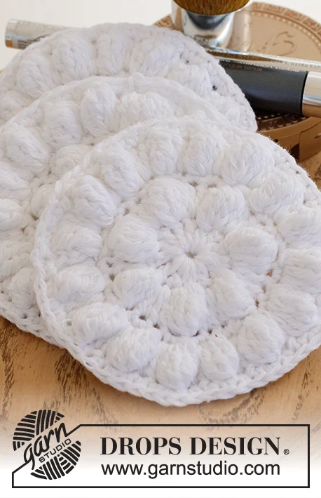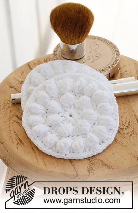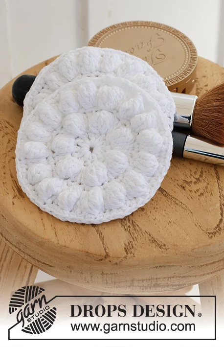 Hæklede makeup pads i DROPS Belle. Arbejdet hækles rundt fra midten og ud med bobler. Tema: Jul.