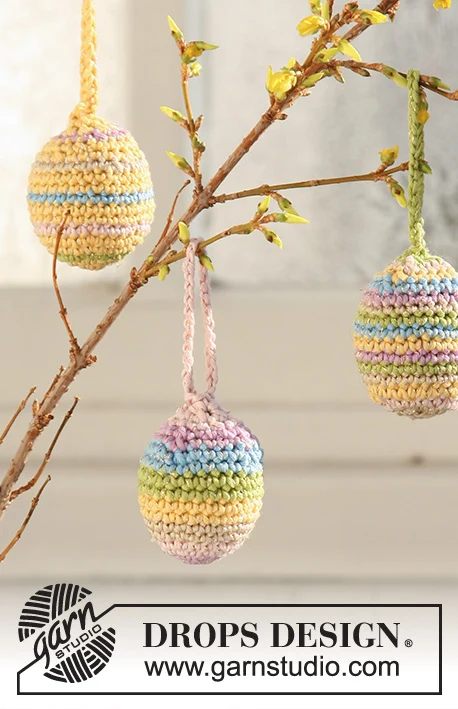 Hæklet DROPS påskeæg og Hæklet DROPS påskekurv i Muskat og Glitter.