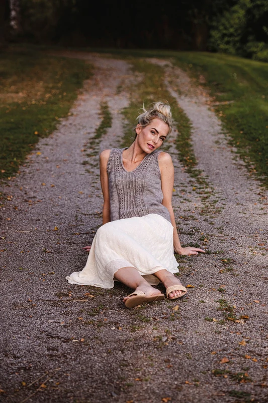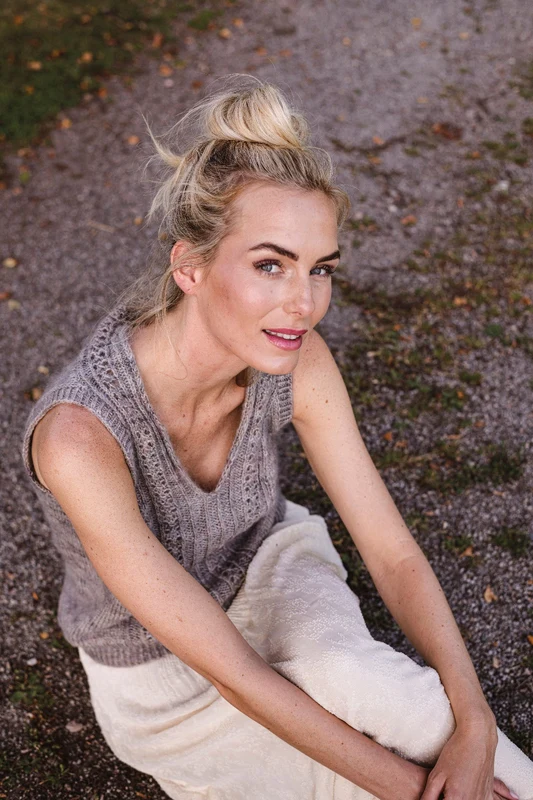 Slipoveren er strikket nedefra og op. Modellen prydes på forstykket af de fineste stisystemer som deler sig og løber op langs V-halsen og lægger sig dekorativt til rette i nakken. Der er strikket med 2 kvaliteter garn, Junior Raggi og Cabrito. Cabrito er en flot håndfarvet kidmohair kvalitet, som giver strikken sit eget og helt unikke udseende.