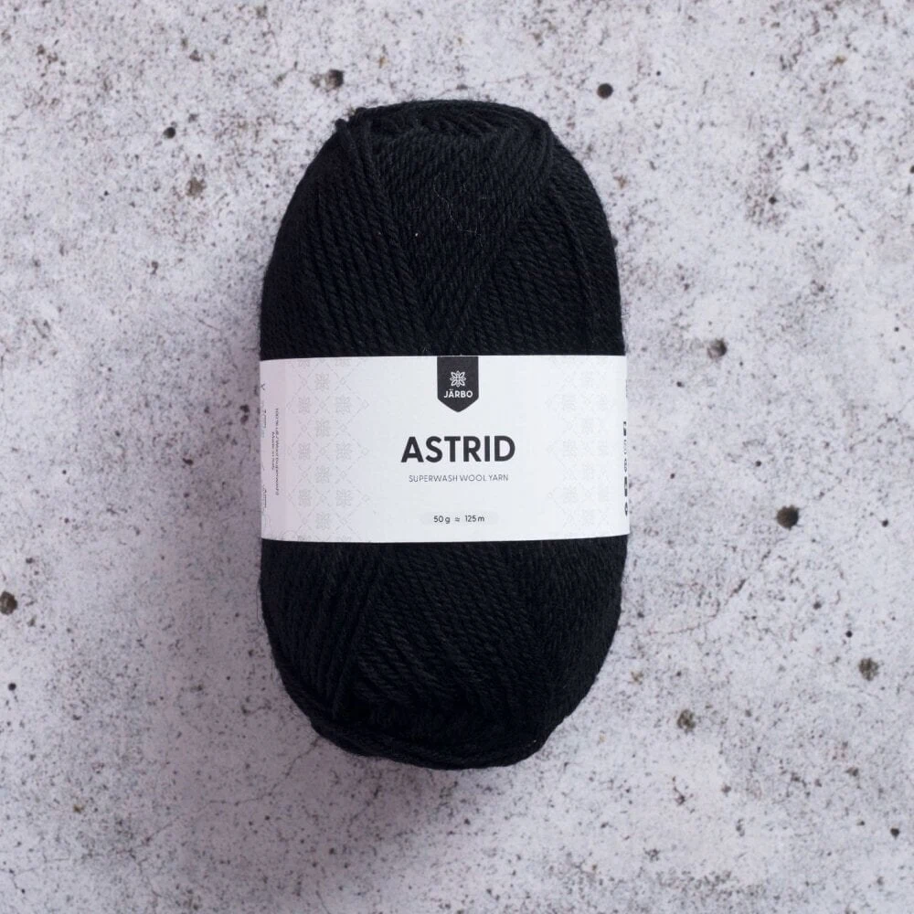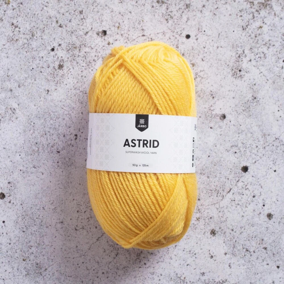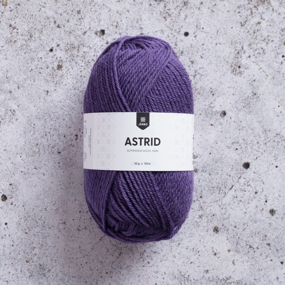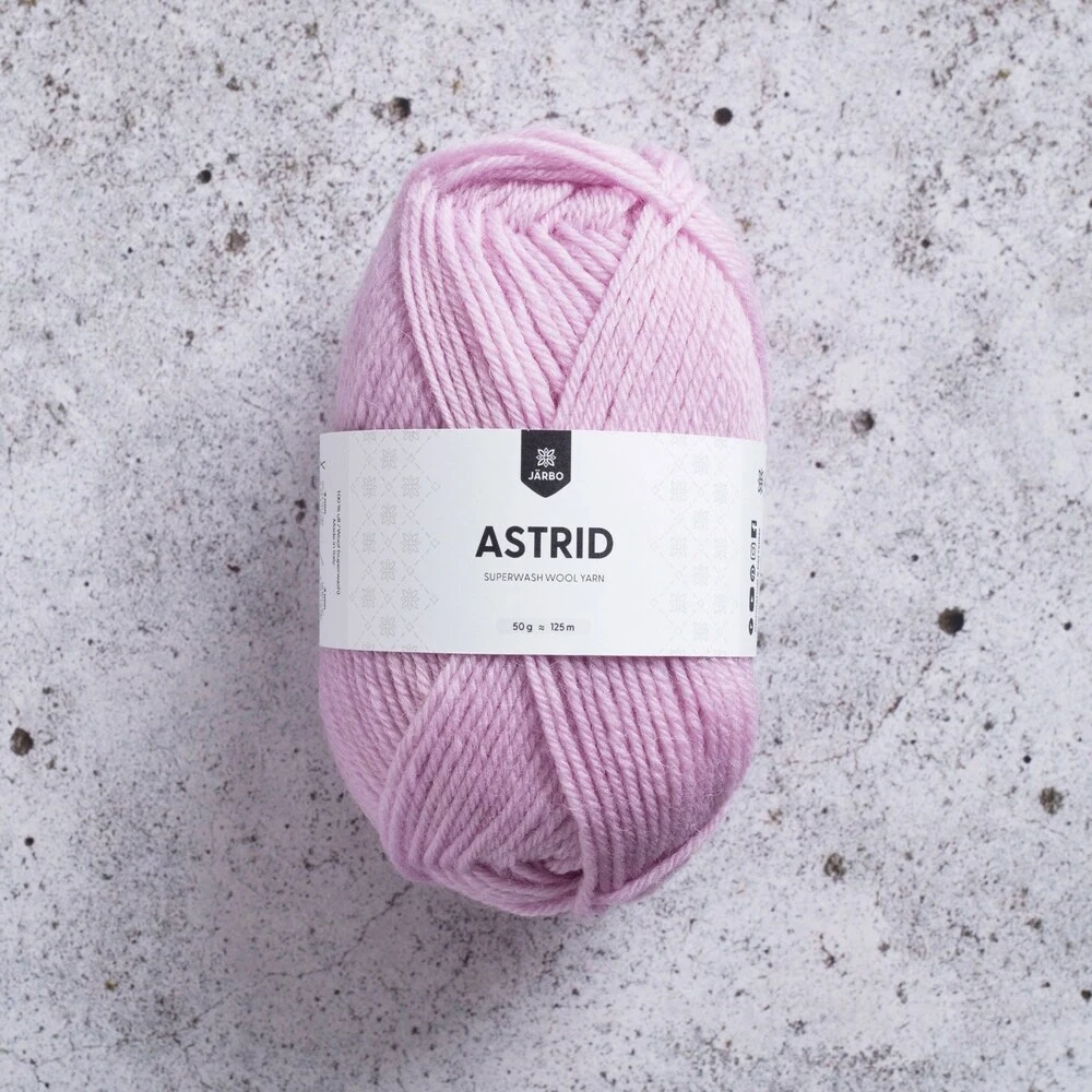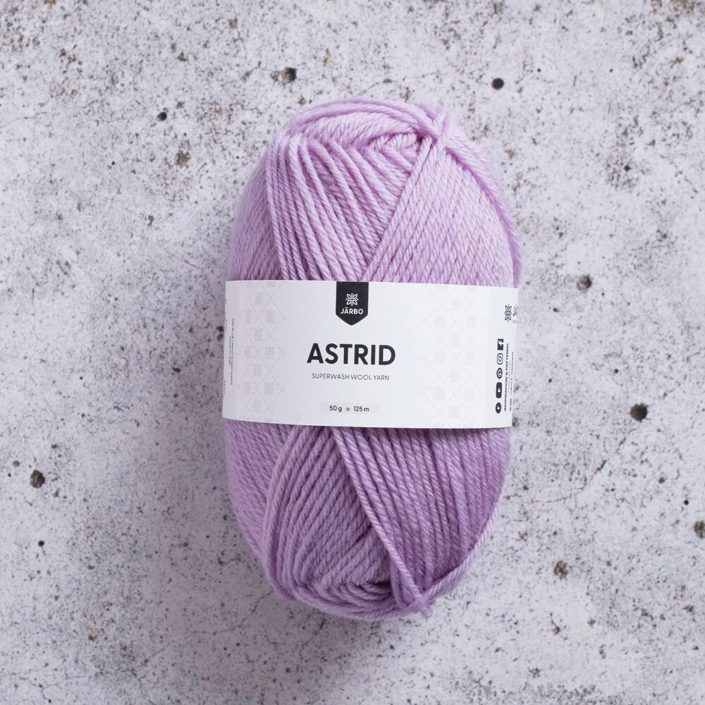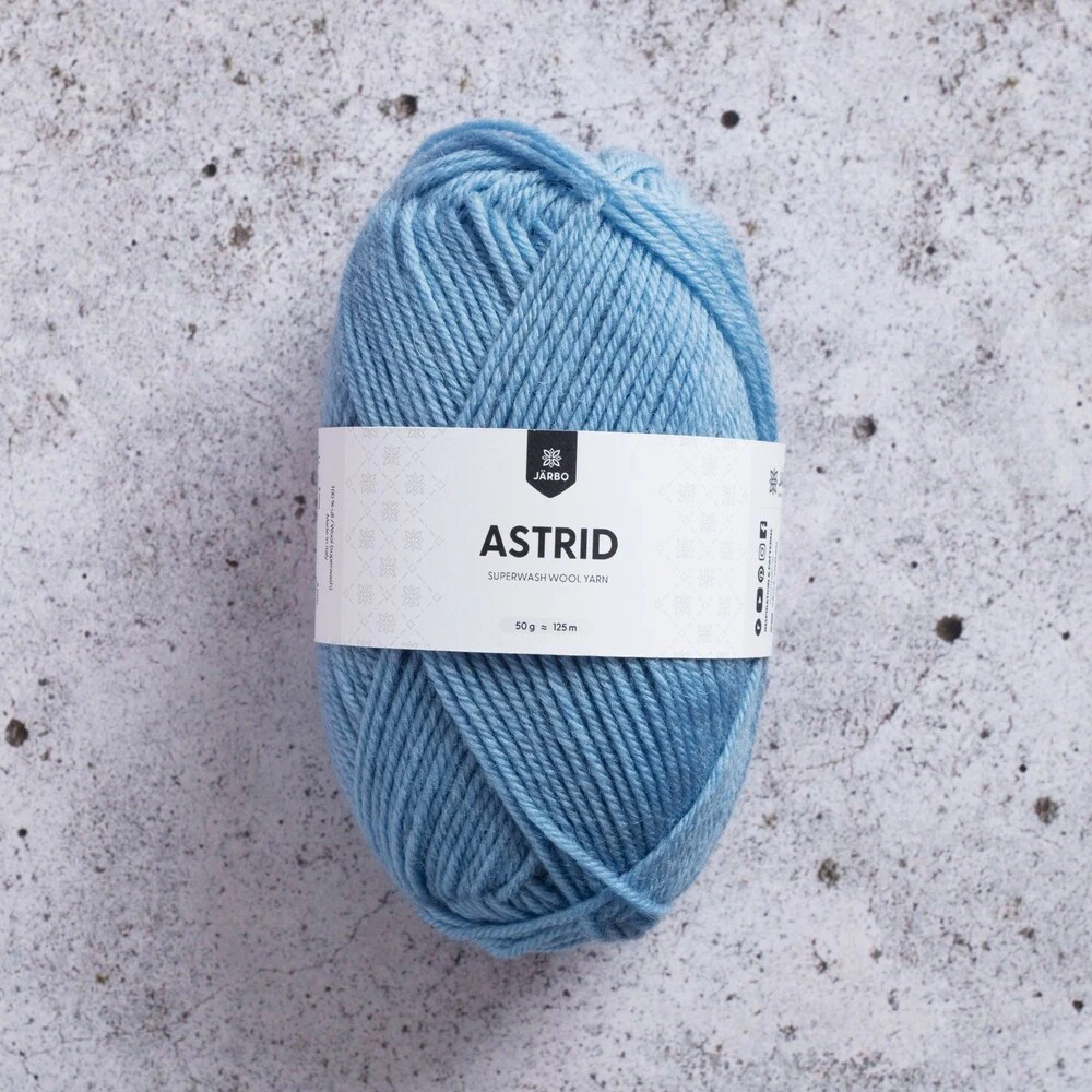 Järbo Astrid er et alsidigt og slidstærkt uldgarn i 100% superwash-behandlet uld. Det tåler maskinvask og er derfor ideelt til både store og små projekter, hvor vedligeholdelse er vigtig. Garnet har en rund og jævn struktur, der giver et flot og ensartet maskebillede, både i strik og hækling.