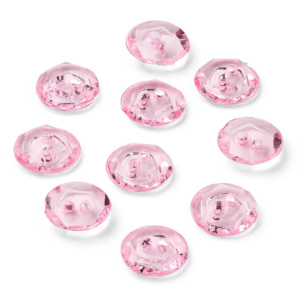 Disse lyserøde krystalknapper fra LindeHobby måler 12 mm i diameter og leveres i en pakke med 10 stk. Knapperne er fremstillet i klar plast med facetslebet overflade, som giver et let skær af glans og farve.