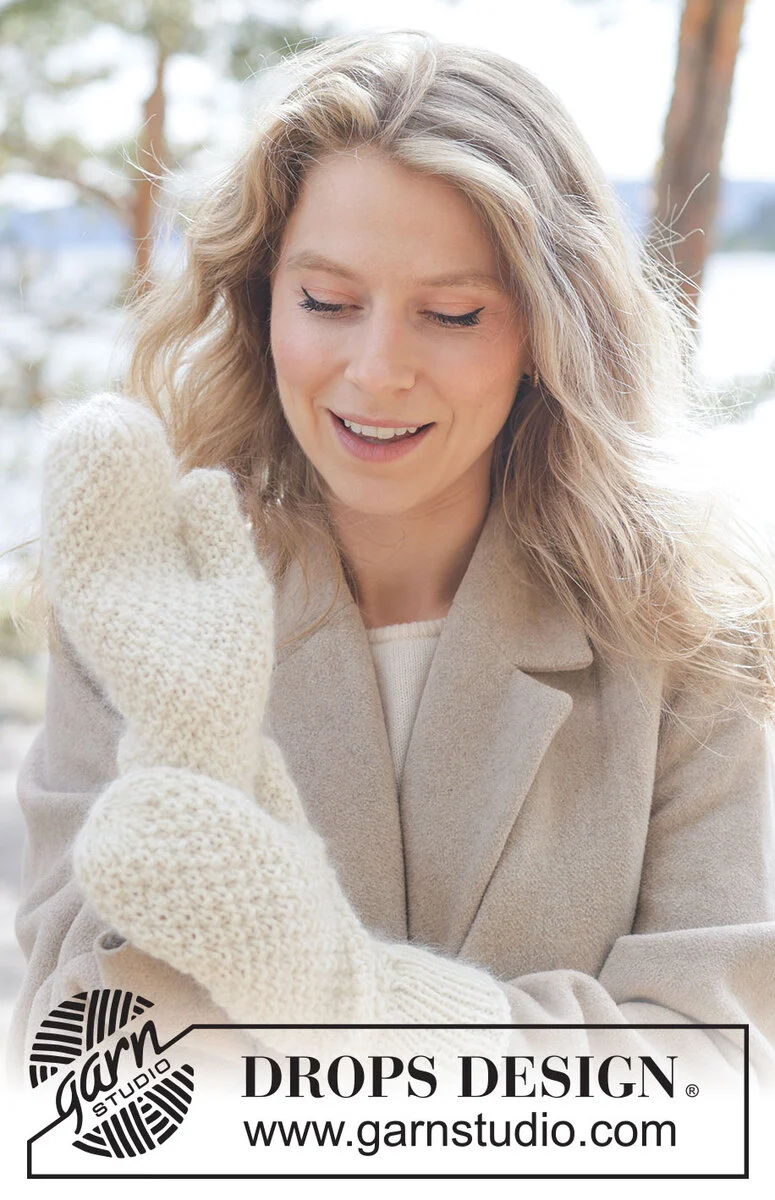 Strikkede vanter i DROPS Lima og DROPS Kid-Silk eller DROPS Daisy og DROPS Kid-Silk. Arbejdet strikkes i perlestrik.