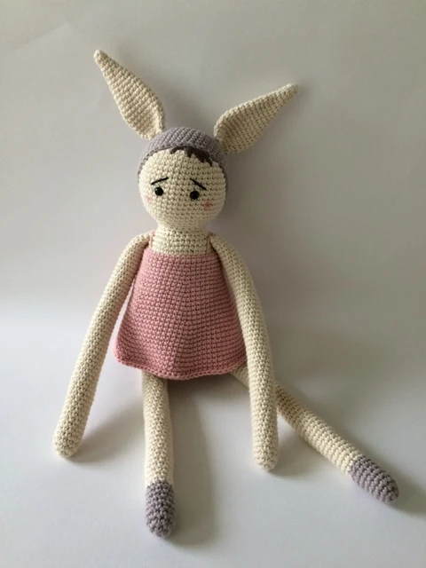 Produktet: Detaljeret hækleopskrift på kaninen Angelika. Angelika Kanin bliver ca. 35 cm lang.