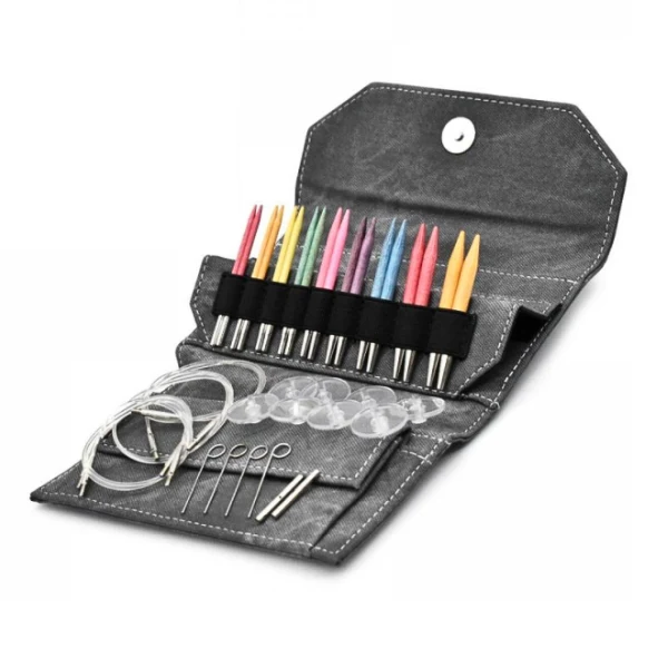 LYKKE Udskiftelige Rundpindesæt Colour er både funktionelt og æstetisk tiltalende. De farverige pinde og det elegante grå denim-etui gør dette sæt til en perfekt ledsager for enhver strikker.