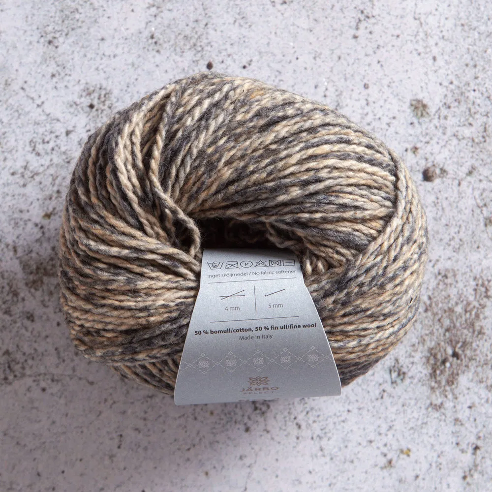 Järbo Select No 4 Botanically Dyed Wool Cotton er et garn fremstillet af 50% bomuld og 50% fin uld. Garnet er plantefarvet i Italien med naturlige materialer som rødder, blade og bark, hvilket giver et roligt og tidløst udtryk. Kombinationen af uldens varme og bomuldens åndbarhed gør det velegnet til brug året rundt.