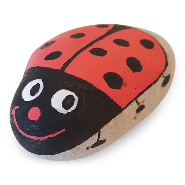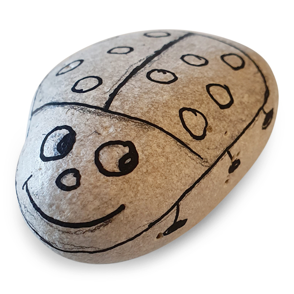 - Når motivet er færdigt, kan du afslutte med et lag stenlak. Lakken får stenen til at skinne, og derudover kan stenen også pynte udenfor i et bed eller på et havebord. Jo flere lag lak du påfører, jo mere skinnende bliver stenen.