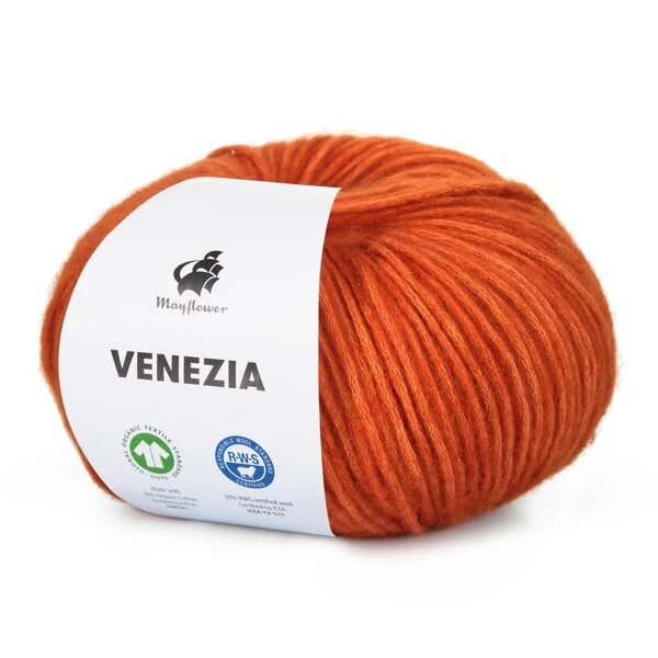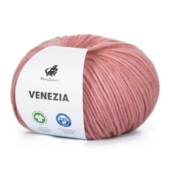Mayflower Venezia er et luftigt og let garn i en skøn blanding af GOTS-certificeret bomuld og RWS-certificeret merinould.