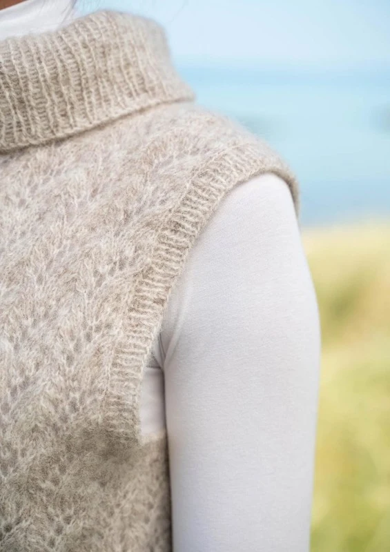 Vesten er strikket i det vidunderlige Mayflower New Sky Light, som har en løbelængde på 300 meter pr. 50 gram og består af 35 % alpaka, 35 % uld og 30 % nylon. Denne kombination giver en perfekt balance, hvor garnet både kan være blødt, varmt og samtidig slidstærkt.