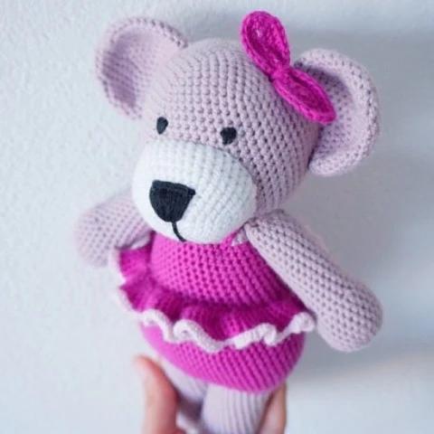 Fru Bjørn: Let læselig og detaljeret hækleopskrift på Fru Bjørn. Fru Bjørn bliver ca. 18 cm høj. En sød lille bjørn med det fineste strutskørt.