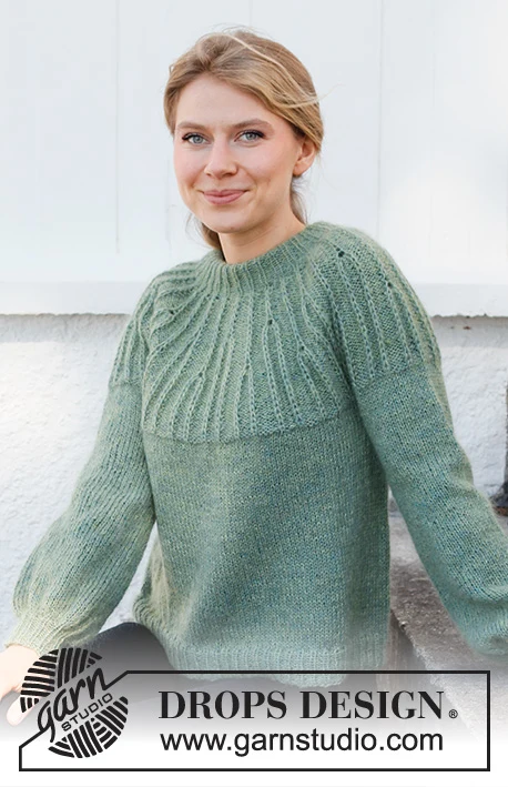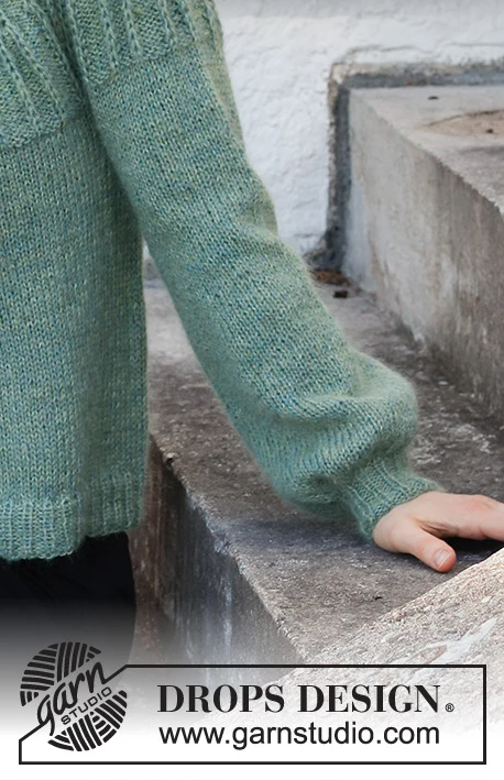 MATERIALER: DROPS ALPACA fra Garnstudio (tilhører garngruppe A) 300-300-350-350-400-450 g farve 7323, havbrise Og brug: DROPS KID-SILK fra Garnstudio (tilhører garngruppe A) 125-125-150-150-175-175 g farve 18, æblegrøn