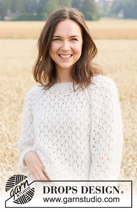 MATERIALER: DROPS BABY ALPACA SILK fra Garnstudio (tilhører garngruppe A)* 250-300-300-350-350-400 g farve 1101, hvid* Og brug: DROPS KID-SILK fra Garnstudio (tilhører garngruppe A) 100-125-125-150-150-175 g farve 01, natur