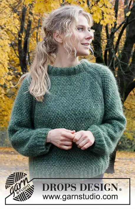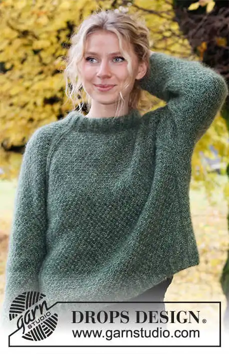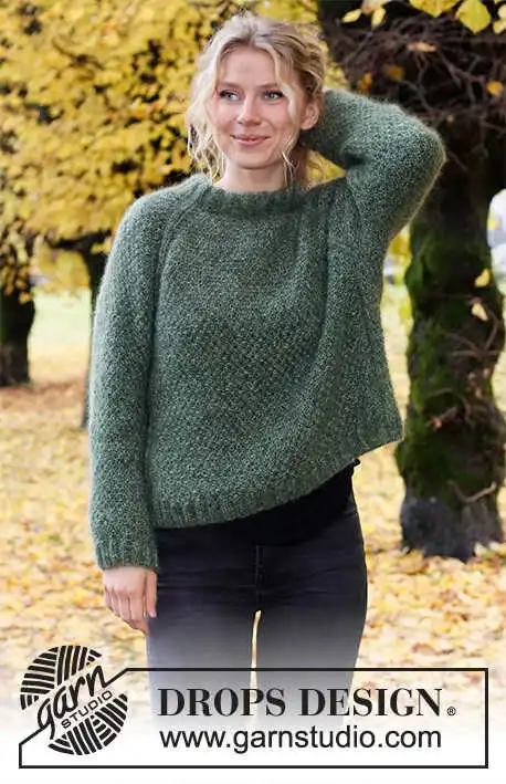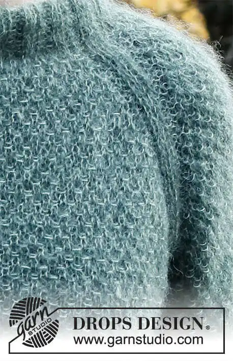 Strikket bluse i 2 tråde DROPS Kid-Silk. Arbejdet strikkes ovenfra og ned med raglan, perlestrik og dobbelt halskant. Størrelse XS - XXL.