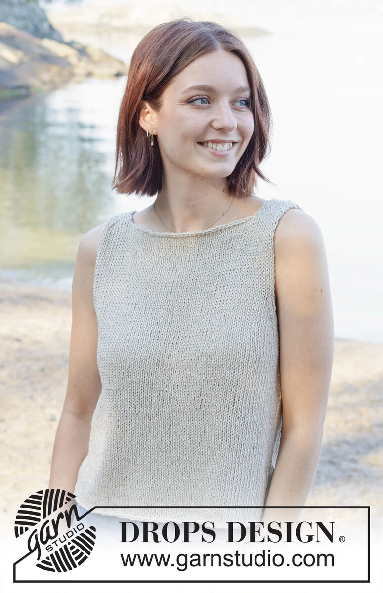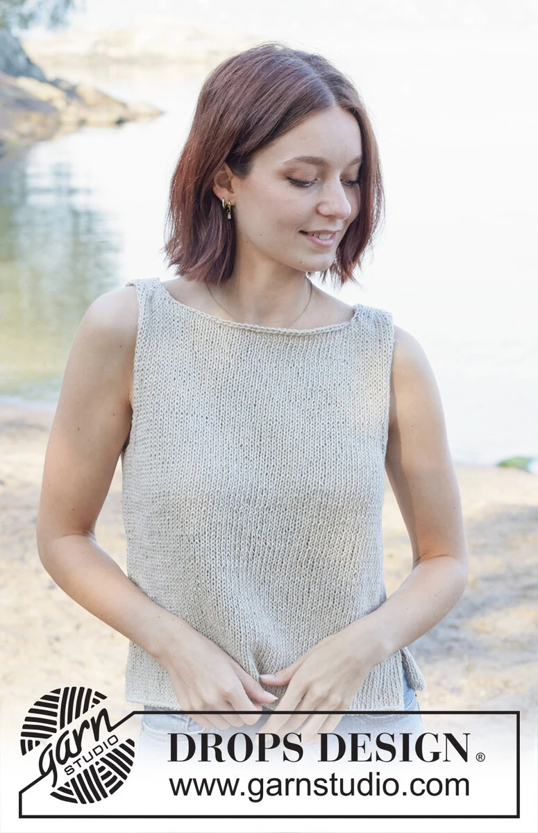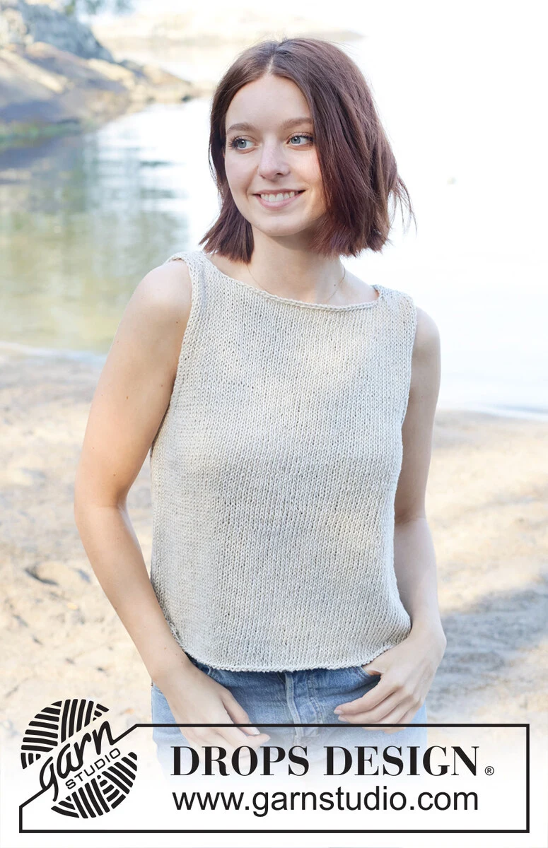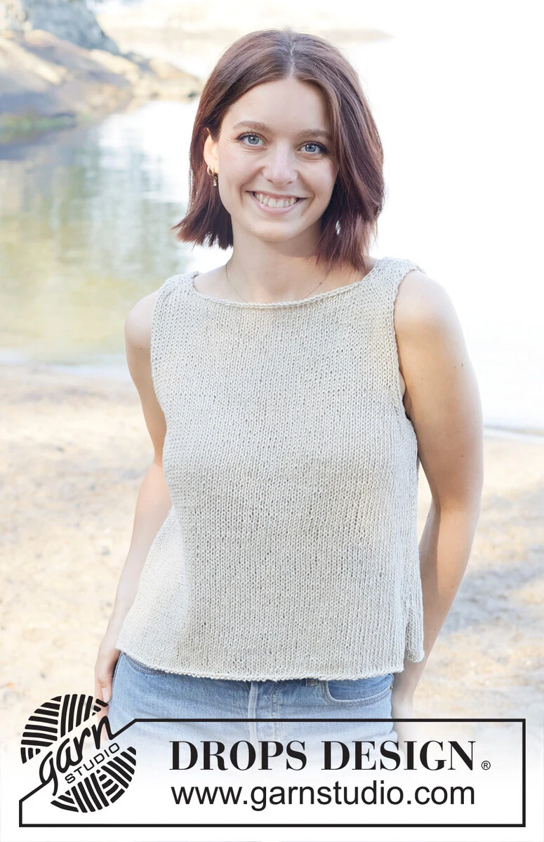 Strikket top i DROPS Bomull-Lin. Arbejdet strikkes nedefra og op i glatstrik med i-cord og båthals. Størrelse S - XXXL.