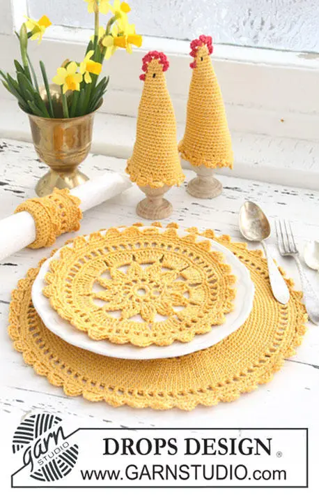 Sættet består af: Hæklede DROPS dækkeservietter, æggevarmere og servietring i ”Safran” og ”Glitter”.