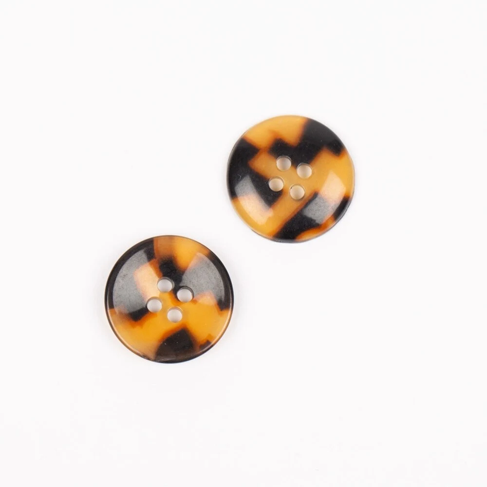 Denne skinnende polyesterknap i skildpaddemønster kombinerer lyse og mørkebrune nuancer, hvilket giver et klassisk og tidløst look. Med en diameter på 20 mm er den perfekt til cardigans, jakker og andre tøjprojekter.